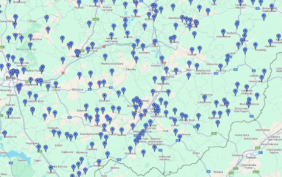 Místa narození západních letců, výseč mapy zachycuje část jižní Moravy: