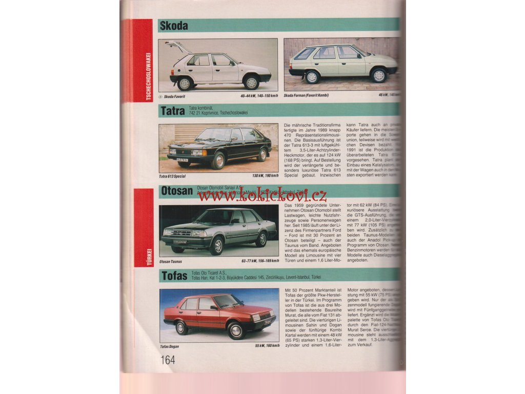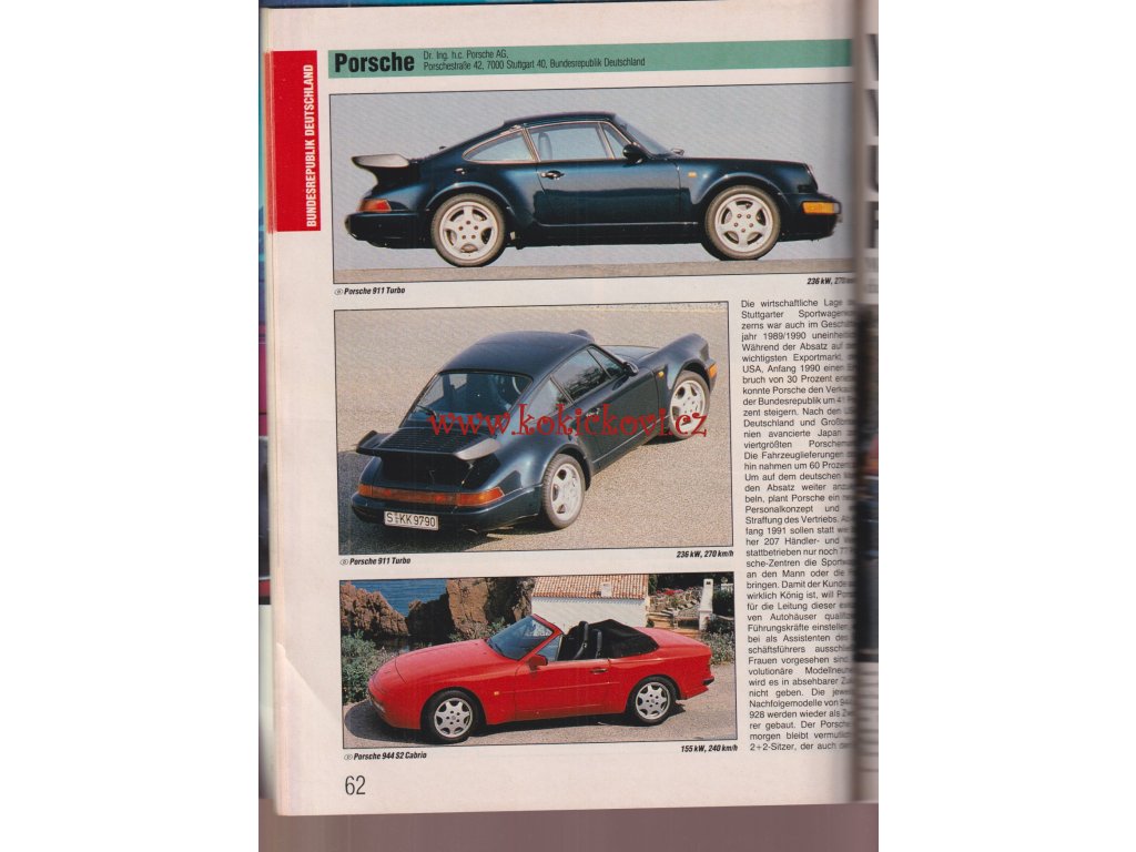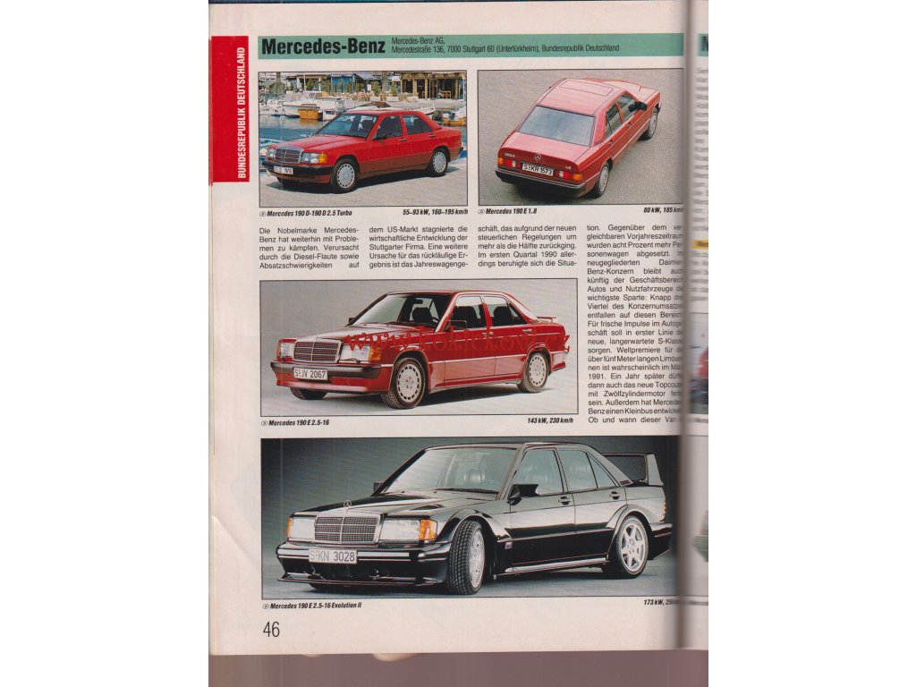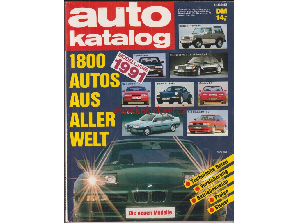 Rozsáhlé A4 vydání německého katalogu automobilů pro rok 1991. Nabízí znovu téměř 2000 modelů po světě tehdy prodávaných modelů, včetně rarit a exotů a tuningových specialit. Fotografie doplňují popisy a technické specifikace s ceníkem na německém trhu. 290 stran, německy, pěkný stav, do sbírky.