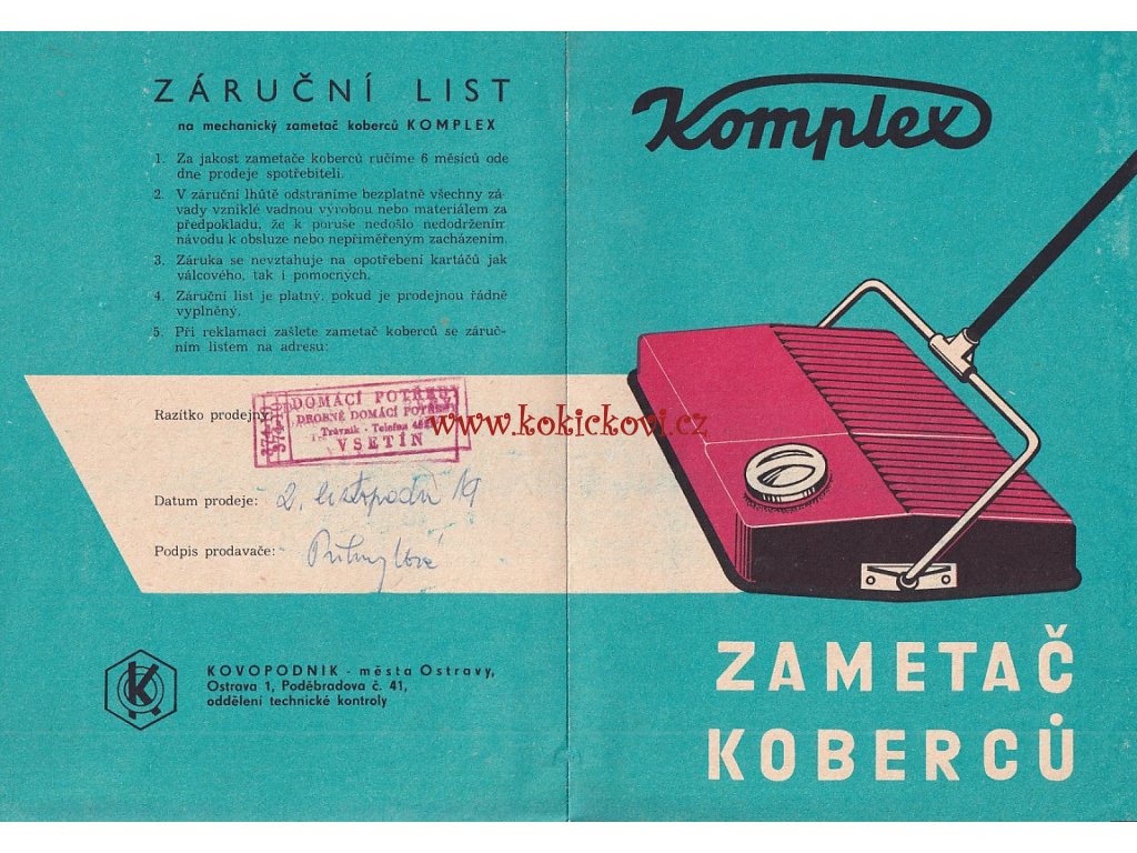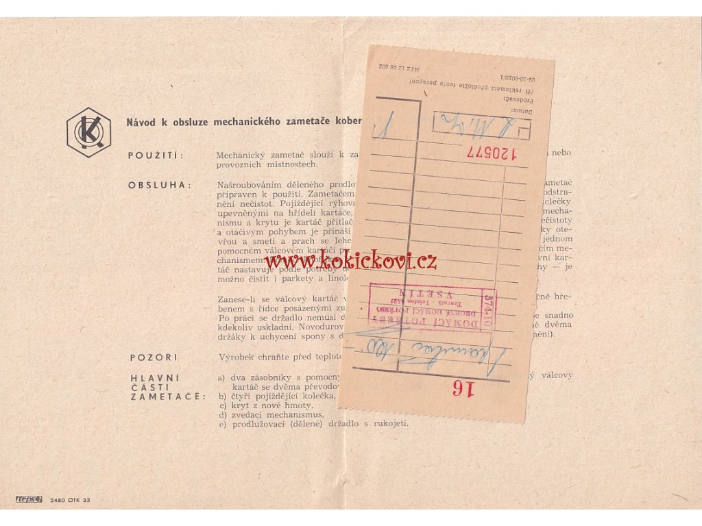 MECHANICKÝ ZAMETAČ KOBERCŮ KOMPLEX S PŮVODNÍM PARAGONEM - NÁVOD K OBSLUZE - SOCIALISTICKÁ REKLAMA