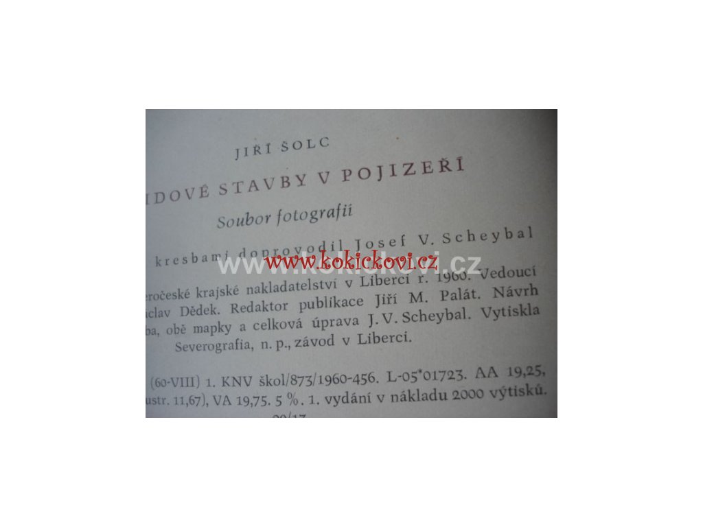 Lidové stavby v Pojizeří. Vydalo Severočeské nakladatelství v Liberci v roce 1961, c. 150 stran, bohatá obr. příloha, nízký náklad pouhých 2000ks (dnes velmi vzácně se objevující publikace). Přes 120 unikátních a neopakovatelných fotografií Jiřího Šolce, kresby a text od Josefa V.Scheybala. Uvnitř rozkládací mapa. Najdete zde stavby a památky např. z oblasti: Mnichovohradišťska, Sobotecka, Turnovska, Českodubska, Železnobrodska, Lomnicka, Jičínska, Semilska, Vysocka a Jablonecka.