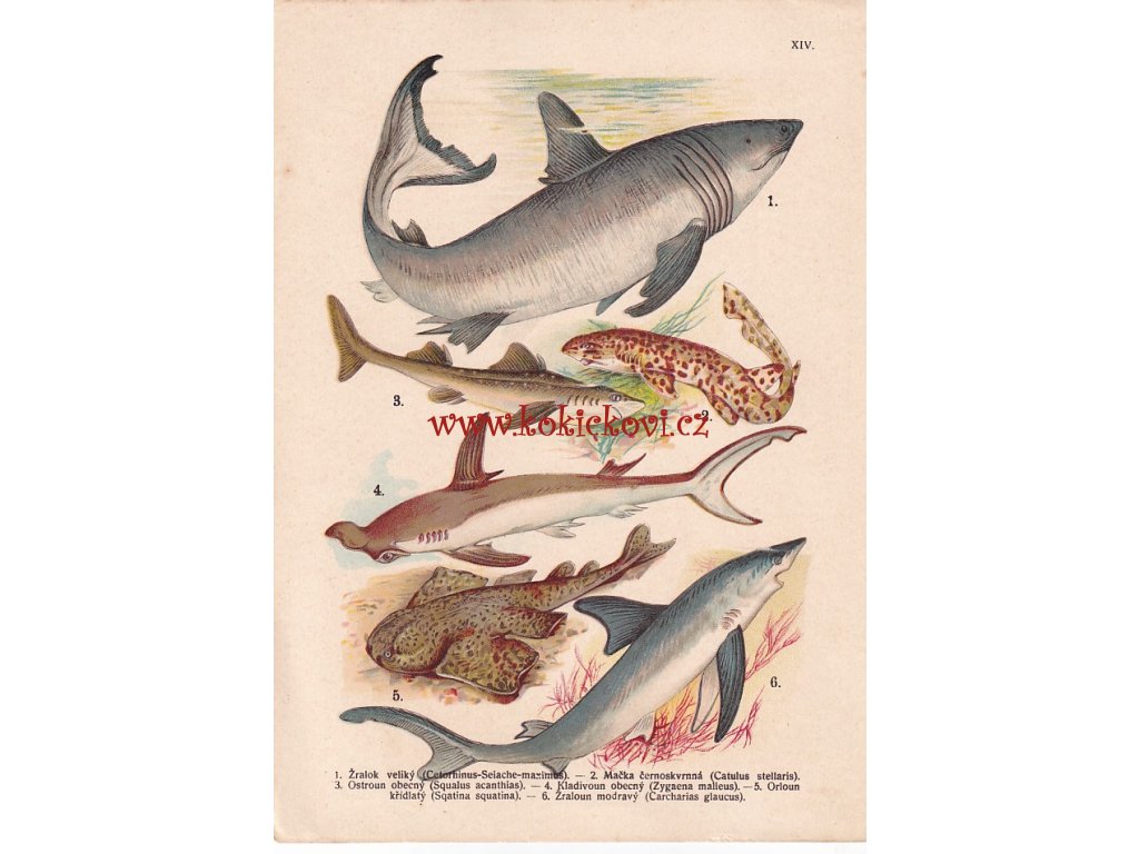 Malá radost pro milovníka žraloků. Přes 100 let stará litografie- A5 - K ZARÁMOVÁNÍ. VHODNÉ TÉŽ JAKO DÁREK PRO NĚKOHO, KDO JÍM JE...